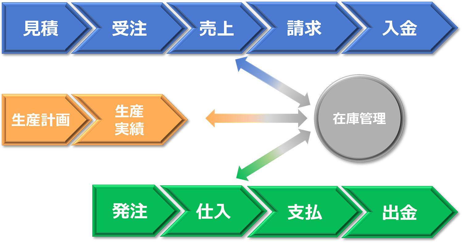 見積・受注・仕入・発注・売上・請求・入金・支払等の販売に関する一連の業務、および生産計画・生産実績等の生産に関する一連の業務を効率的に管理する為のシステムです。