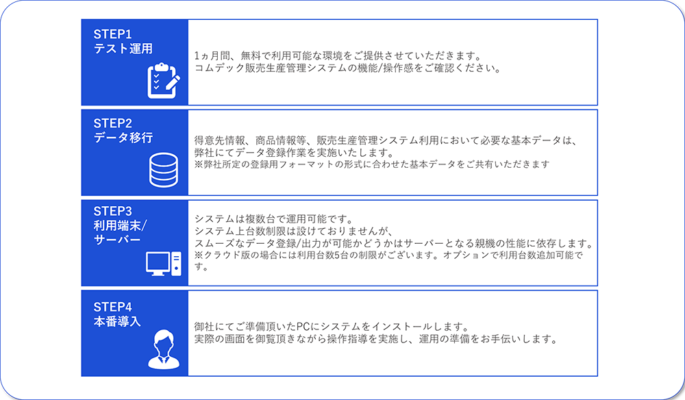 - 環境構築 ルール作りの支援はすべてリモート形式、もしくはコムデックへのご来訪にてご対応させて頂きます。