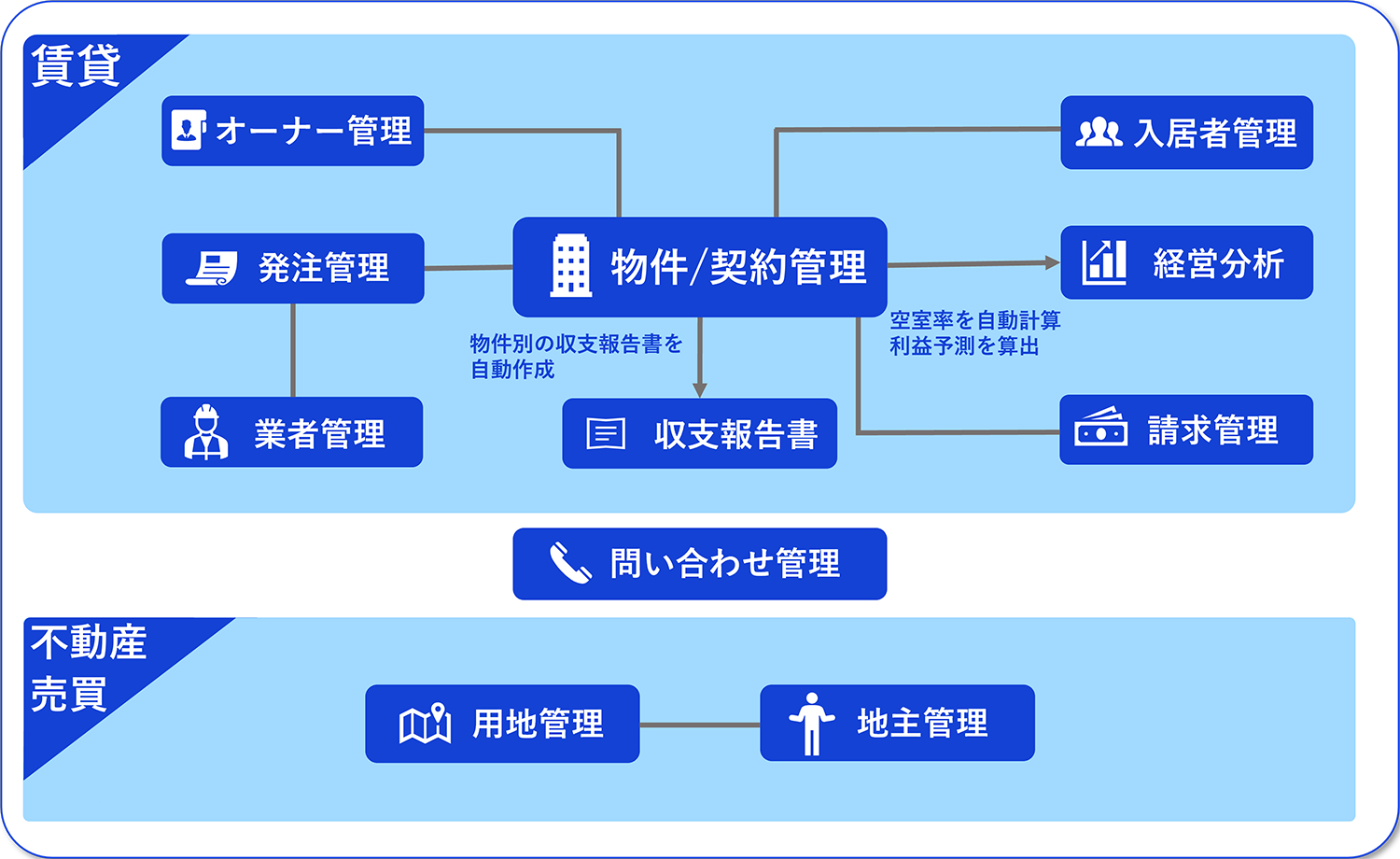 土地、建物、アパート等の賃貸/不動産売買/分譲に関わる管理業務を