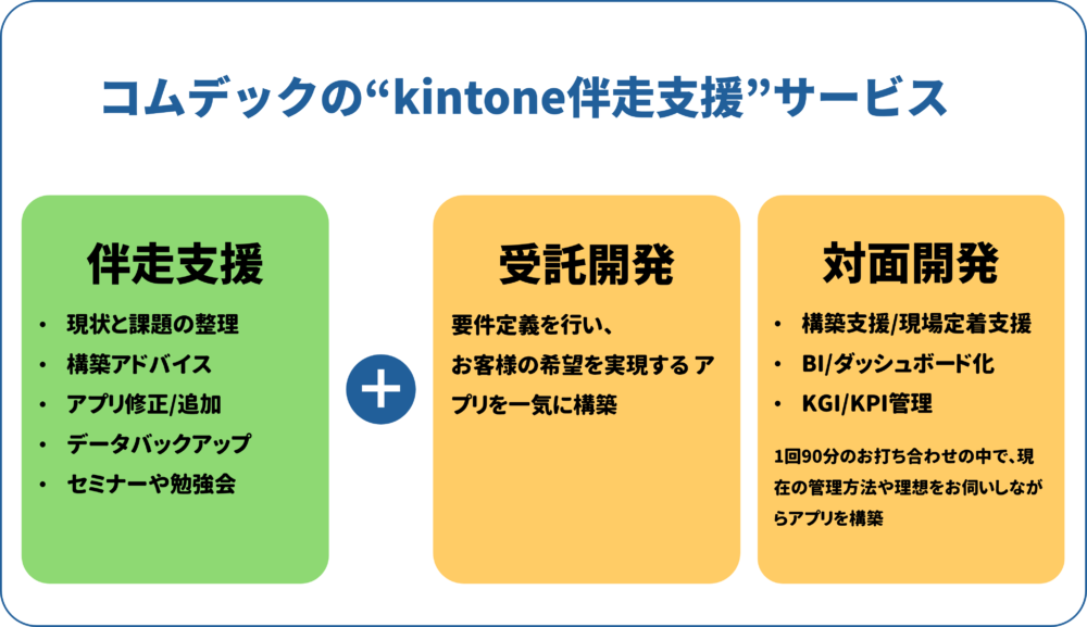kintone伴走支援サービスでは、「伴走支援」をベースとして、「受託開発」や「対面開発」を組み合わせていただくことで、スピード感をもって業務改善に取り組むことができます。
