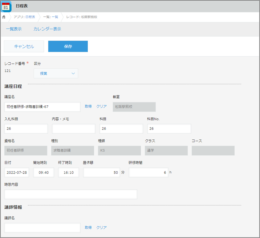 例えば、ひとつひとつの授業予定レコードが管理アプリから展開された段階では、まだ授業を担当する講師が割り当てられていないため「講師名未設定」のところに表示されます。