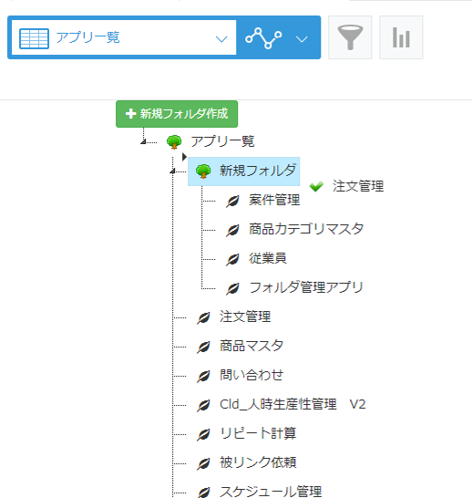 kintone内全てのアプリが表示されているため、「新規フォルダ作成」をクリックして新しいフォルダを作り、そこにドラッグ&ドロップでアプリを入れていきます。