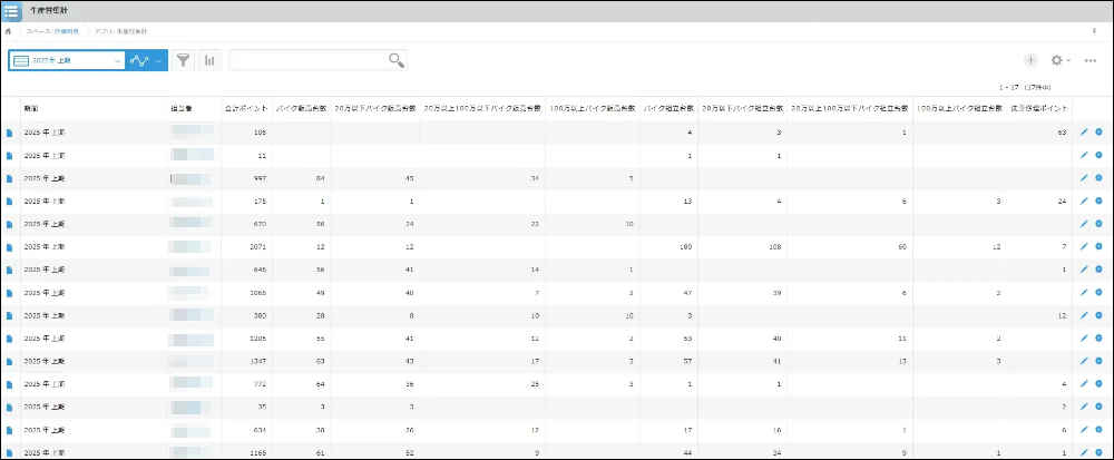 「生産性集計アプリ」のレコード一覧を開くと、縦軸にスタッフ名、横軸に「販売台数」や「組立台数」といった評価項目が並んでおり、ひと目で合計と内訳が分かるようになっています。