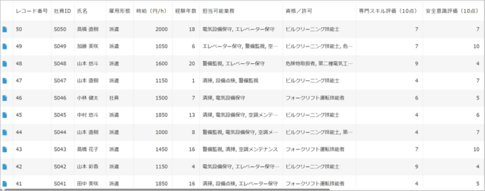 このアプリでは、派遣社員の氏名、時給、経験年数、保有資格、評価などを管理します。