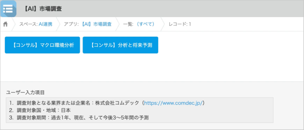 今回は、市場調査のなかでも外部環境調査のフローをkintone × AIで効率化する仕組みを構築しました。