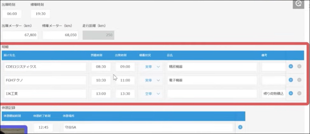 各フィールドへの入力はそれほど難しくありませんが、ドライバーのITレベルや利用端末によっては明細テーブルへの入力が難しいというケースも少なくありません。