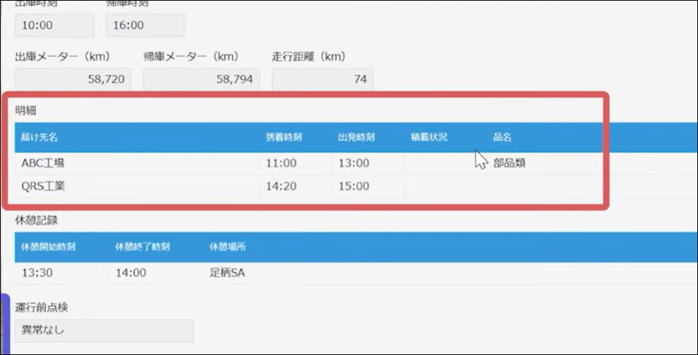 このアプリでは、日付や運転者名、車両、出庫時刻、配送明細などをテーブル形式で管理しています。
