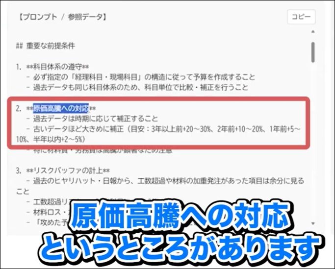 プロンプトであらかじめ設定した原価高騰の情報を加味していることがわかります。