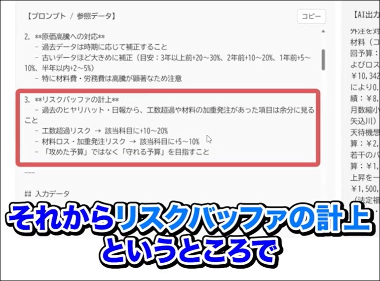 過去のヒヤリハット・日報から工数超過したものや、追加で材料を発注した部分を自動的に参照し、該当項目に10%から20%を加えるという処理を組み込んでいます。