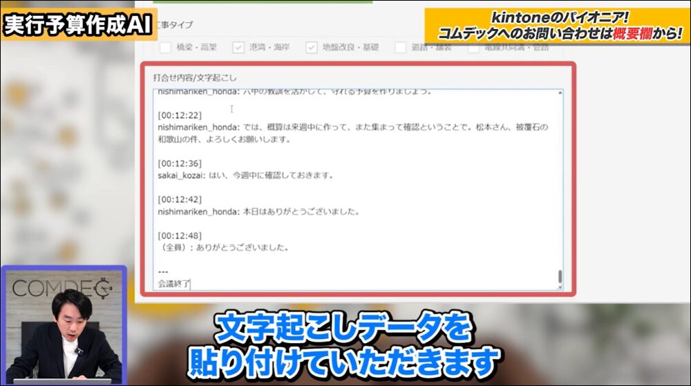 次に、工事タイプの下にある「打ち合わせ内容/文字起こし」というところに、この工事に関する打ち合わせの議事録の文字起こしデータを貼り付けます。