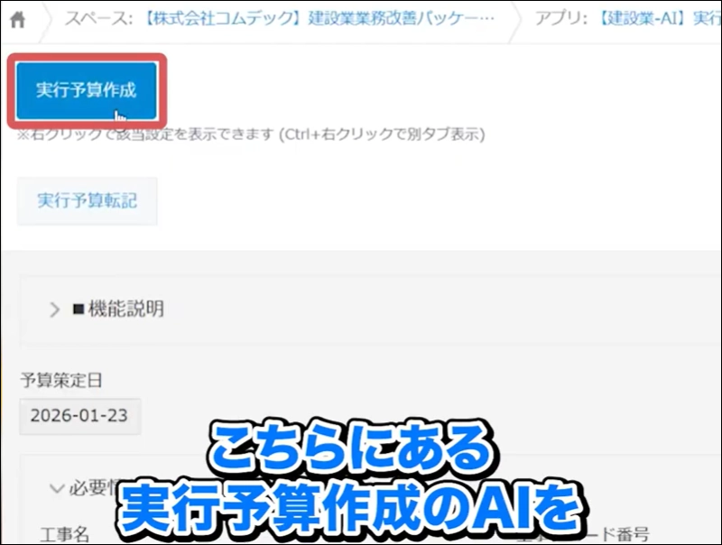 まず、実行予算案を自動的に作成してくれるAIアプリで、実行予算を作成したい工事名を取得します。