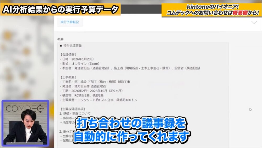 AIの分析が完了すると、入力した文字起こしのデータから打ち合わせの議事録が自動的に作成されます。