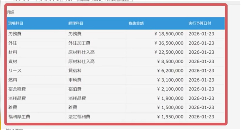 議事録の下には、以下のように実行予算を算定したものが表示されます。