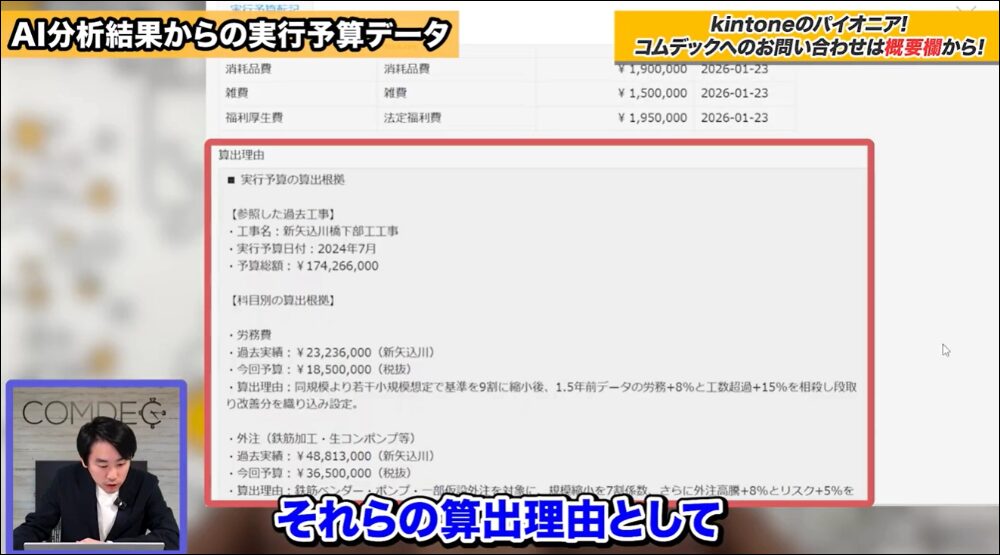 kintone for 生成AIを活用すれば、過去の案件情報、原価高騰データ、ヒヤリハットの記録から実行予算案を自動で作成することが可能です。
