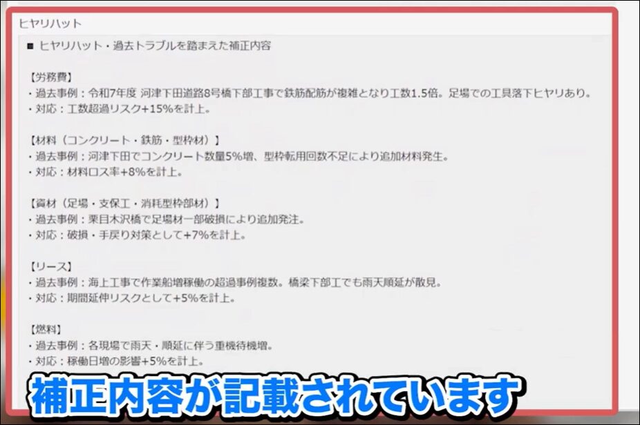 さらにヒヤリハットの項目には、算出した実行予算に加えて、過去のトラブルやヒヤリハットの内容を踏まえた補正内容が記載されます。