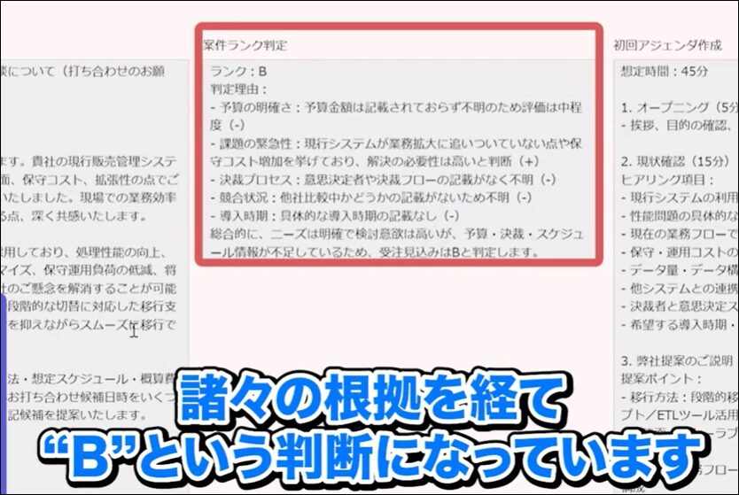 さらにAIは、過去の類似案件のデータから案件の受注見込み度を自動でランク付けし、判定の根拠も提示してくれます。
