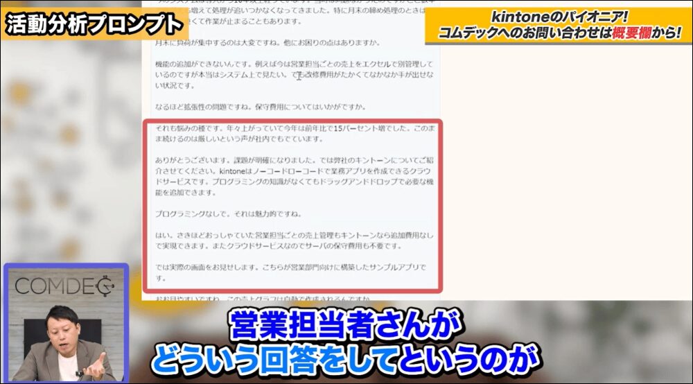 そこで、自社のkintone(キントーン)に蓄積された問い合わせ管理や商談記録のデータを生成AIに学習させれば、「このお客様には効率化より属人化解消という言葉の方が響きます」など、自社の商談記録に基づいた具体的なアドバイスをもらえるようになります。