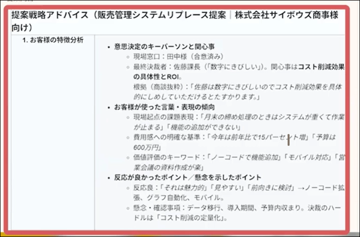 「現状の課題確認(15分)」「類似事例の紹介(10分)」などの時間配分を含めた提案の順番が示されるだけでなく、「コスト削減より現場の負荷軽減という言葉が響きやすい」のような話し方のポイントまでアドバイスしてくれます。