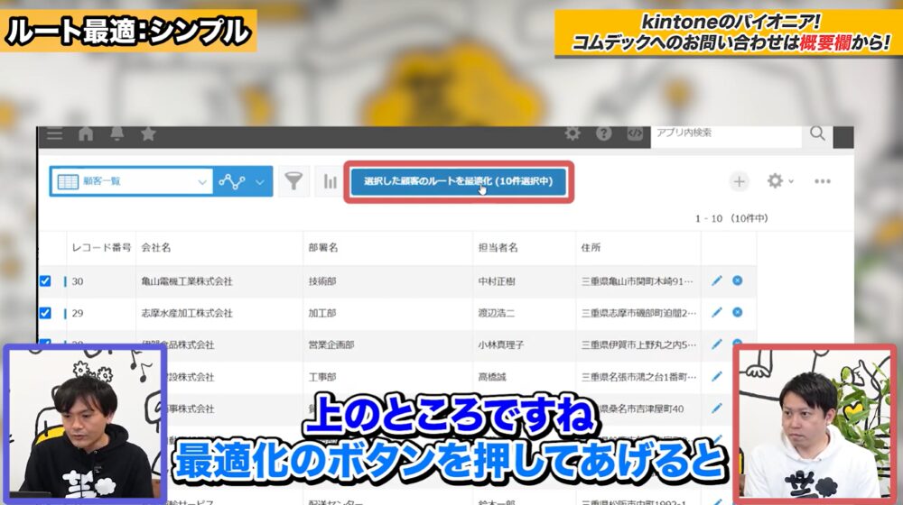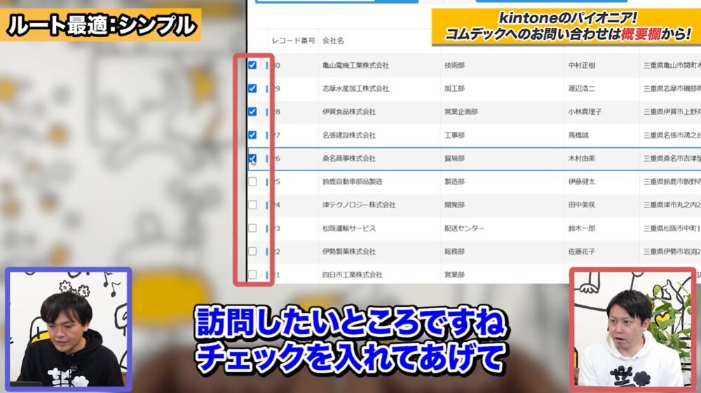 はじめに、kintoneの「顧客情報アプリ」のレコード一覧画面を開き、訪問したい企業10社にチェックを入れます。