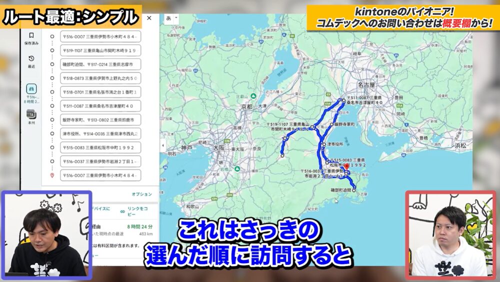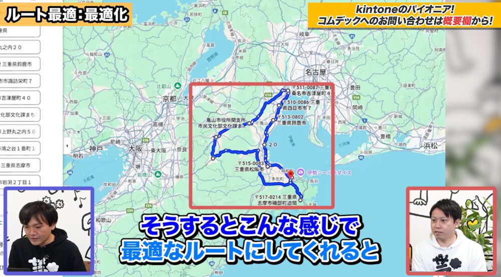 このGoogleマップとkintoneをAPIで連携すれば、瞬時に最適なルートを作成できます。