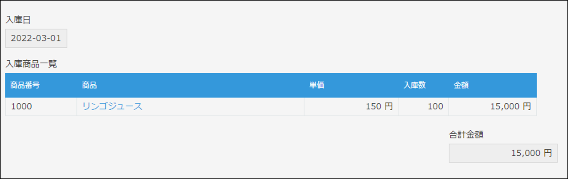 まず、入庫管理アプリには以下の通り商品100個の入庫を登録しました。
