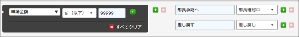 経費申請の例で言うと、「上長承認後、申請金額が10万円未満は部長決裁」「10万円以上は役員決裁」などです。