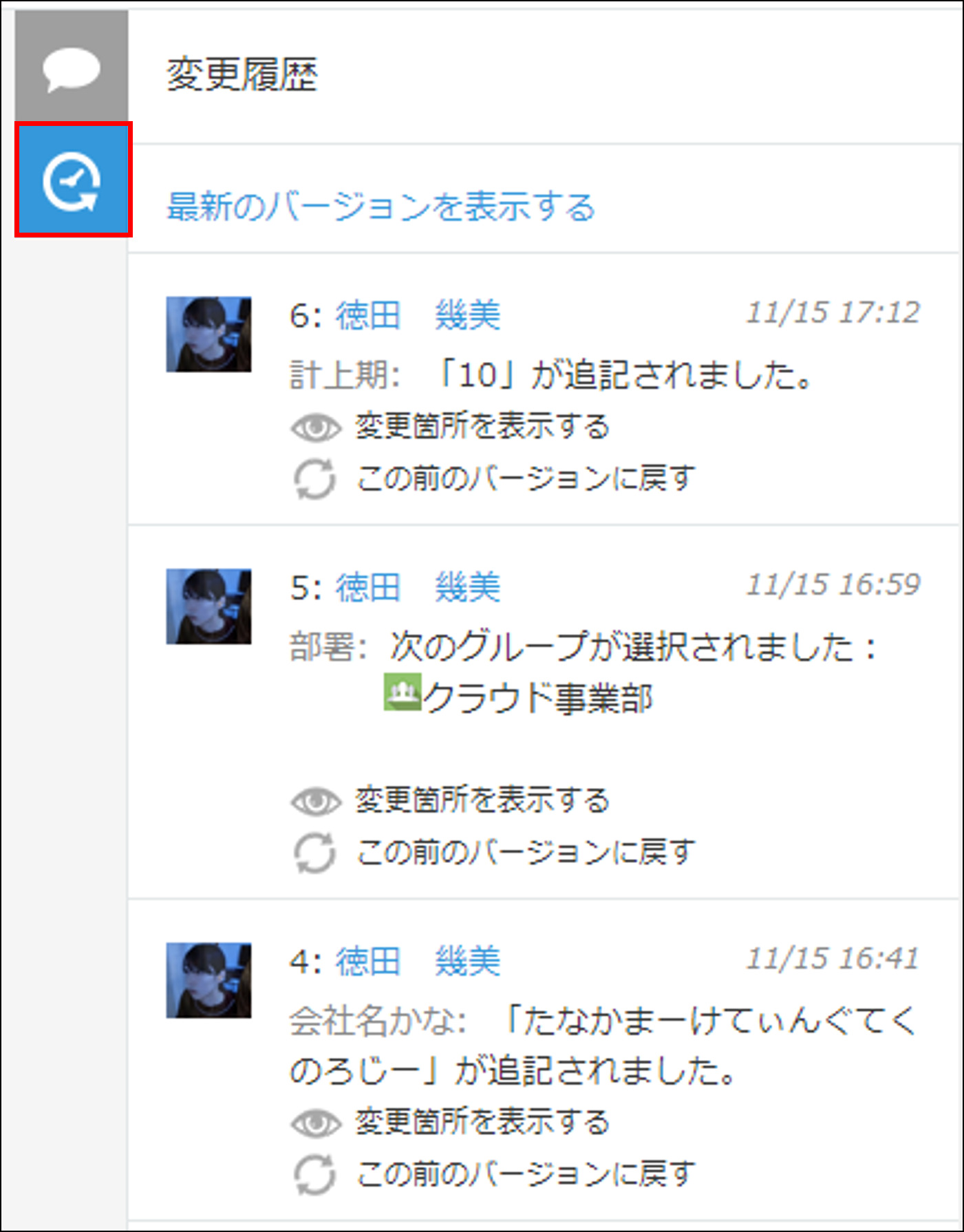 kintoneでは、データベース内の特定のデータについて、誰が何を編集したのか、編集前後の内容が記録・表示されます。