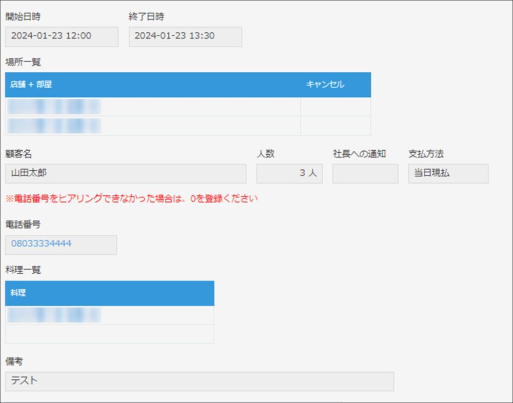 予約日時や対象の店舗、お客様の連絡先等、これまでは紙に書いていた情報を登録できるようになっています。
