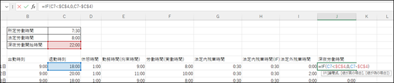 ※IF文で、「退勤時刻が深夜労働開始時間より大きい場合」を入れておくと、深夜まで労働していない場合には0時間となります。