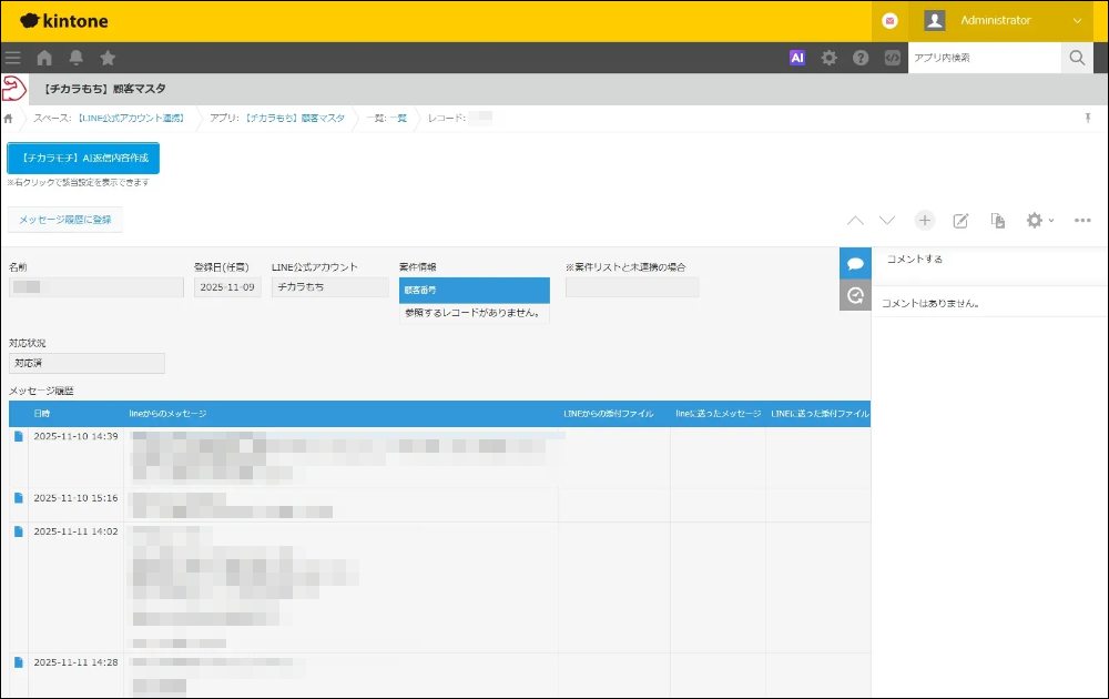 メッセージごとにレコードが作成され、それらが関連レコードとして顧客マスタのメッセージ履歴に表示されます。