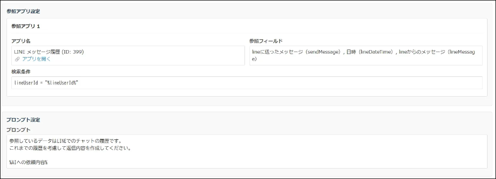 LINEメッセージ履歴アプリの中で生成AIに参照してほしいフィールドを指定し、検索条件として対象となる顧客のユーザーIDが自動で検索されるように設定することで、関連するメッセージ履歴が参照されるようになっています。