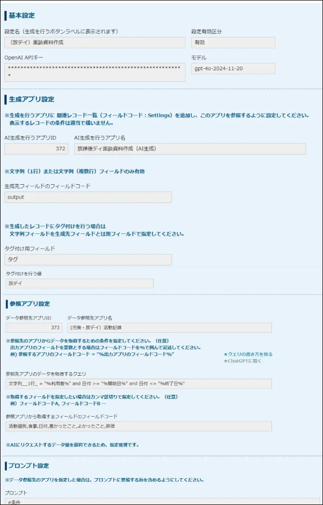 ステップ2では、kintoneの中でChatGPTを使えるように、以下のようなChatGPT連携設定用アプリを作成してAPI連携を行いました。