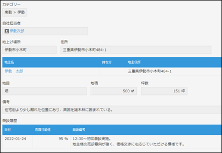 土地の基本情報を管理するだけではなく、その土地に関する商談記録を登録できるようになっており、担当者以外でも商談の状況を把握することができます。