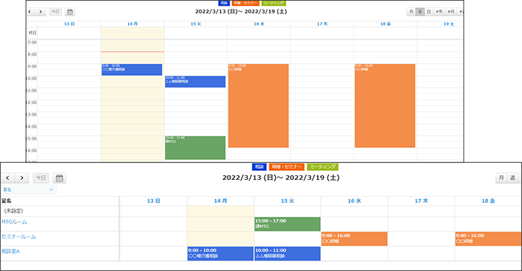 相談室や各会議室、備品の貸し出し状況をカレンダー上で視覚的に表示できる機能です。