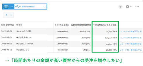 お客様の基本情報を管理する顧客管理アプリと、お客様からのご依頼を登録する案件管理アプリの情報、さらに従業員が日々の業務記録を登録する運転日報の情報を取りまとめて集計することで、従業員ごとの運転稼働率や顧客・案件別の採算分析を行うことができます。