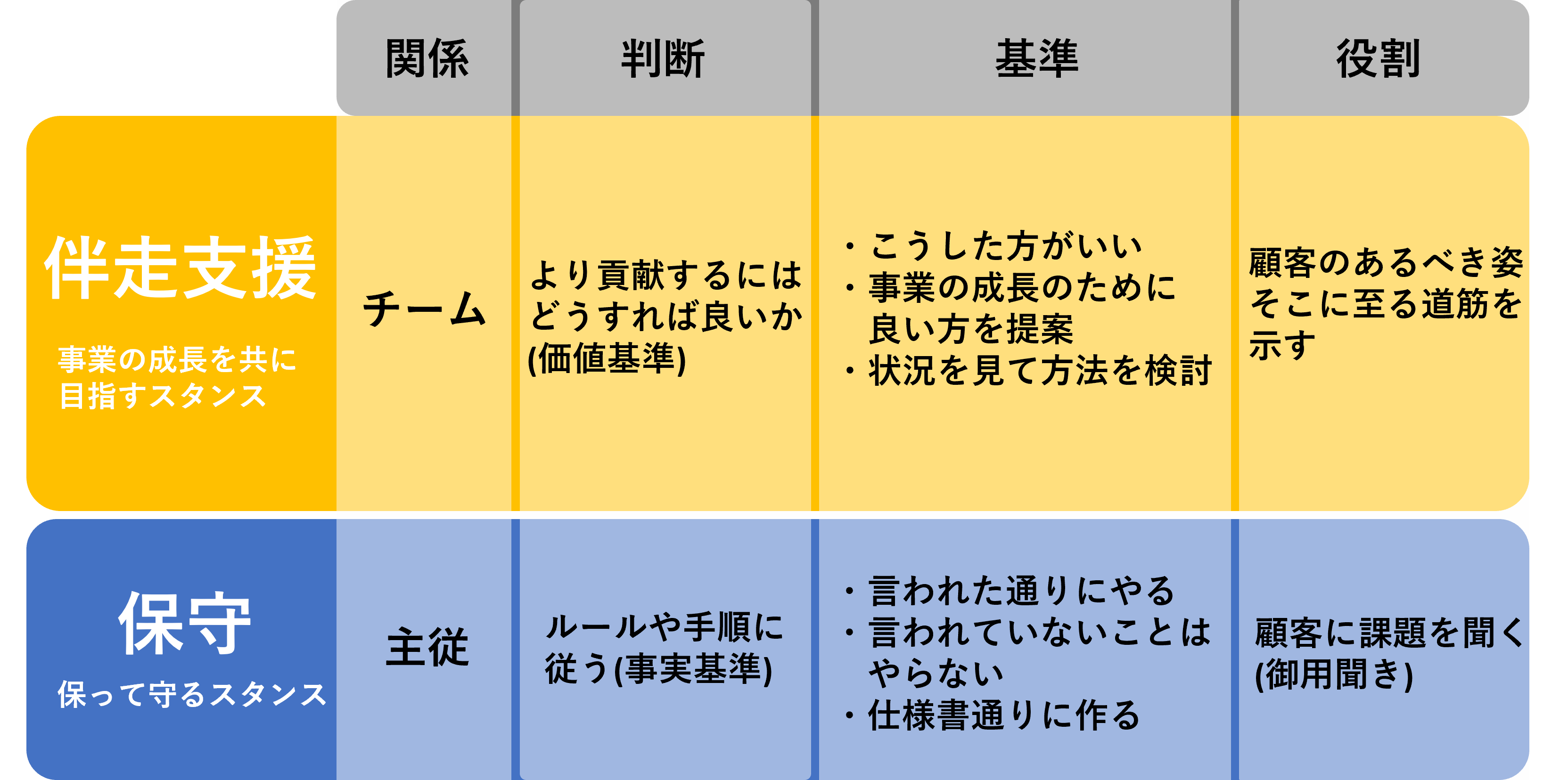 | 保守保って守るスタンス | 主従 | ルールや手順に従う (事実基準) |