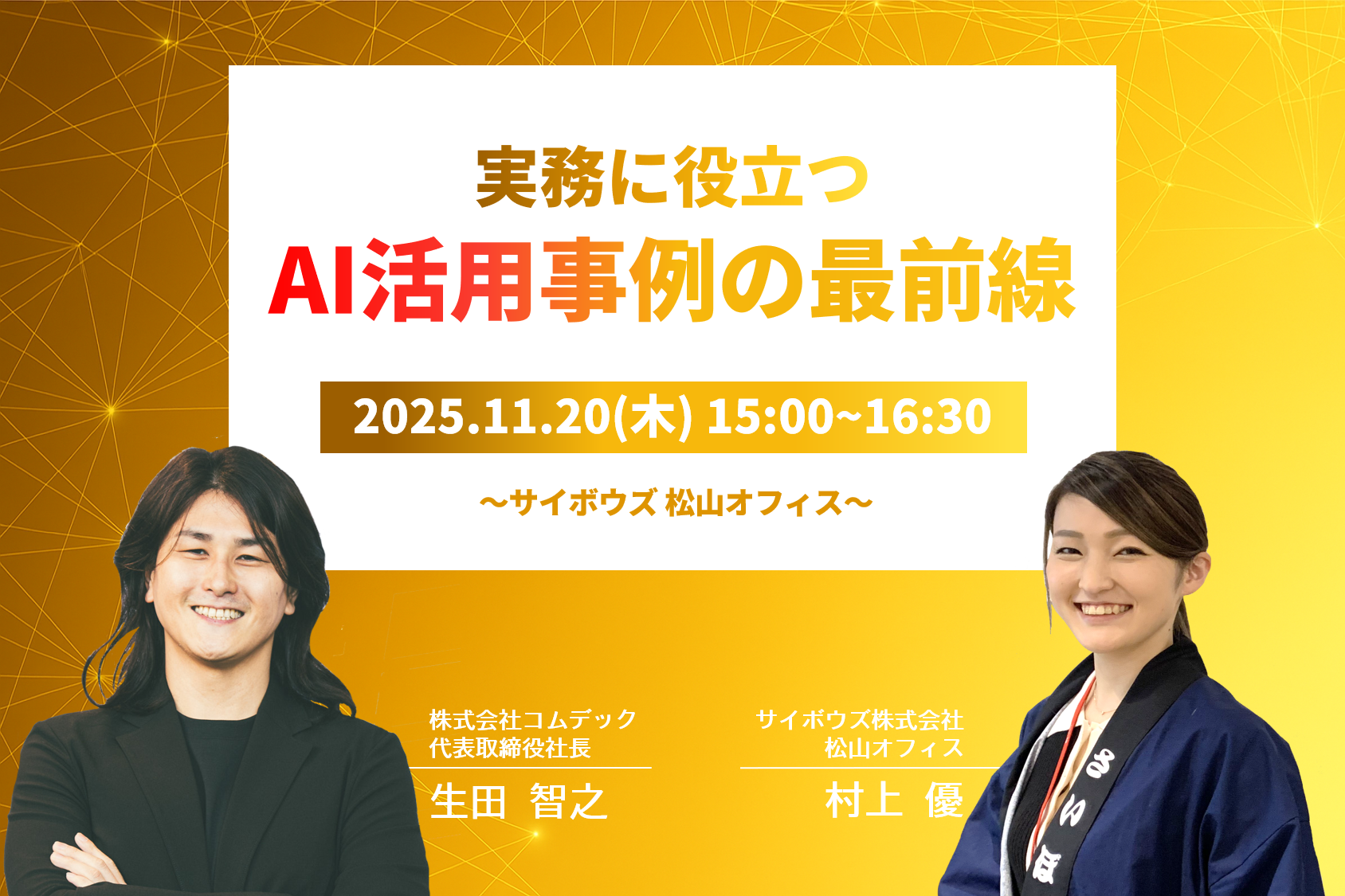 HOME セミナー情報 最新のkintone × AI について学ぼう! in 松山 開催日:2025年11月20日(木) 15:00~16:30 最新のkintone × AI について学ぼう! in 松山 開催概要 開催日時:2025/11/20(木) 15:00~16:30(予定) 開催場所:愛媛県松山市二番町3-7-12 QUALITA MATSUYAMA 3階(受付) 定員:先着25名 セミナー内容 時間 登壇者 テーマ 15:00~15:20 サイボウズ株式会社 松山オフィス 村上優 業務効率化を実現する kintone と生成AI 15:20~15:40 株式会社コムデック 代表取締役社長 生田智之 最新のkintone × AI活用について 15:40~16:30 – kintone × AI 体験会 お申込みフォーム 関連記事 ARTICLE 2025.09.22 最新のkintone × AI について学ぼう! in 松山 2025.09.11 税理士向けkintoneご紹介セミナー 2025.09.11 建設業向けkintoneご紹介セミナー 2025.09.09 kintone × AI セミナー 2025.07.28 kintone × AI セミナー in 広島 2025.05.21 コムデック万博2025 2024.06.21 IT活用戦略セミナー2024 2023.06.27 IT活用戦略セミナー2023 ~Think about the future~ 業務効率化 個別相談会 概要 CONFERENCE オンライン等にて、お客様の悩みに合わせた業務効率化についての個別相談を随時実施しています。日程やお時間についてはお気軽にご相談ください。 個別相談について問い合わせする セミナー/講演会 SEMINAR 「IT活用を成功に導く3つのステップ」や、「IT活用事例」について理解を深めたい方はこちら セミナーの講演依頼をする 資料請求 お問い合わせ